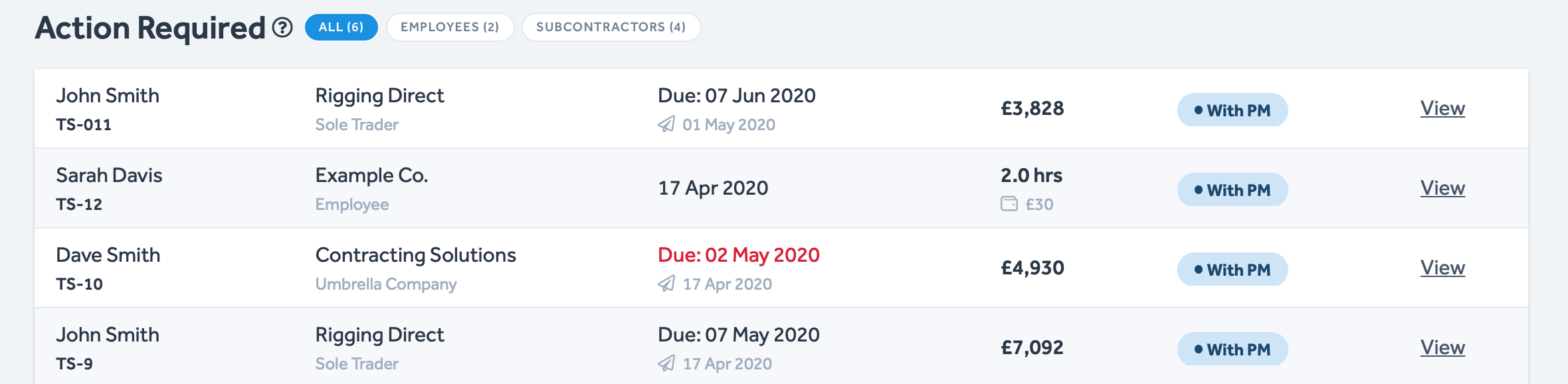 - Clicking on Employees or Subcontractors (next to the Action Required title) will filter the table to show only timesheets from the specified role.