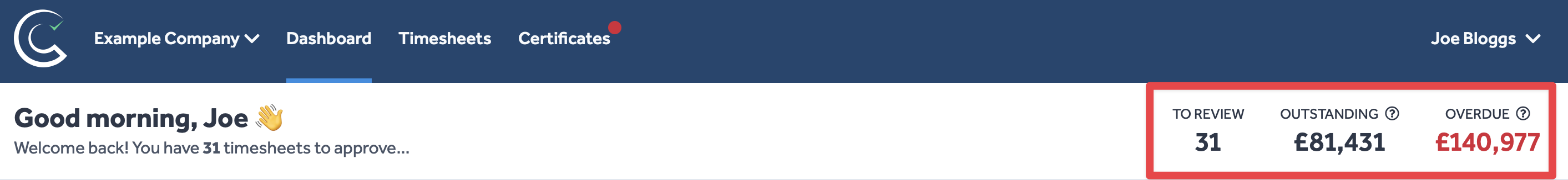 - Overdue: The total outstanding value of overdue timesheets. The due dates of overdue timesheets are displayed in red.