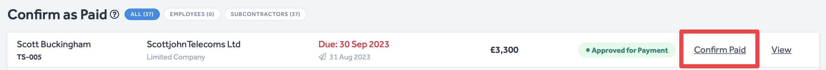 - Once paid, click Confirm Paid to remove the timesheet from the table and update its state to Paid.