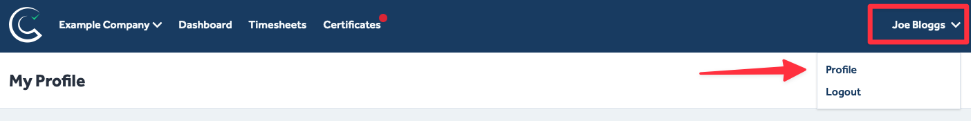 - Click on your name in the top right corner (in the header) of any Certifi page.