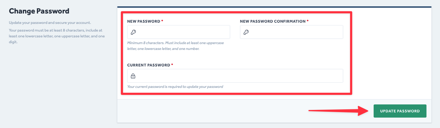 - Fill out the fields to create a new password and click Update Password.