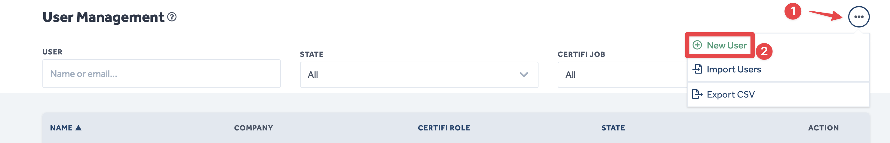 - Click on the circle with 3 dots in the top right, and then select New User from the dropdown.