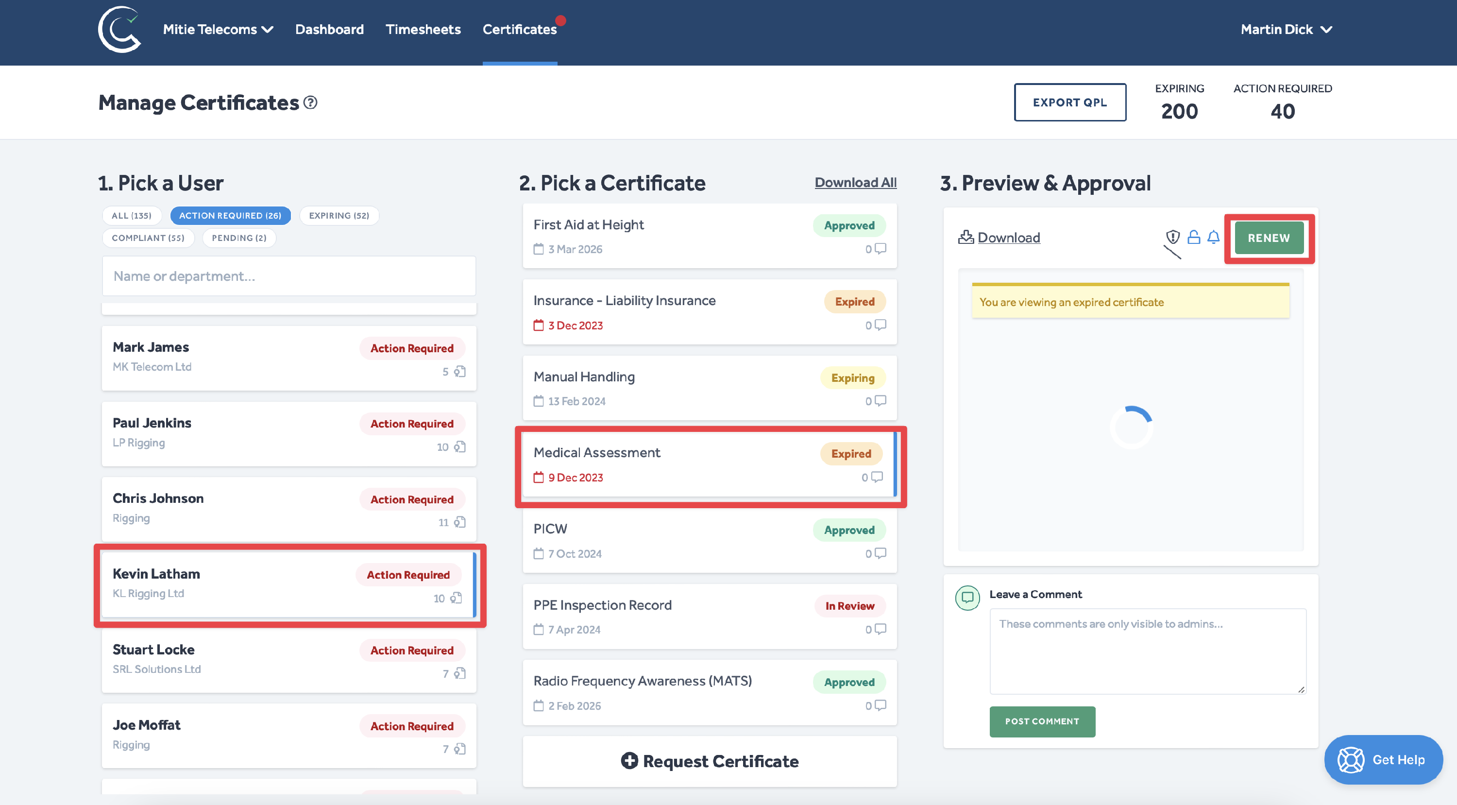 As an Admin user, you can renew certificates on behalf of Worker users. To renew a certificate, follow these steps: