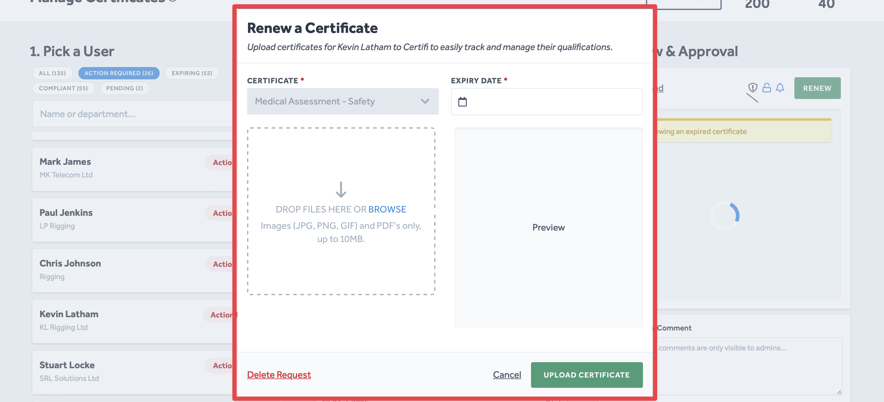 Certificates with Approved, Pending, Expiring or Expired tags can be renewed. Certificates tagged as In Review must be approved or rejected before they can be renewed. Get more information about approving and rejecting certificates here.