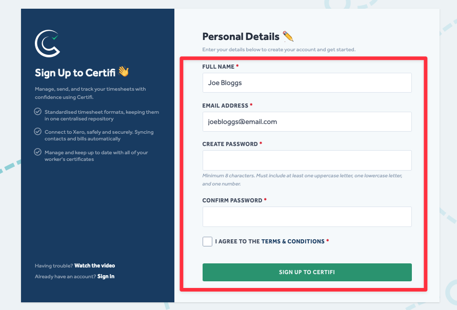 - You will be taken to the Sign Up to Certifi page to fill out your details and create a password.