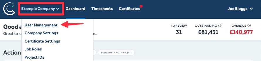Navigate to the User Management page by clicking on your company name (in the page's header) and then selecting User Management from the drop-down list.
