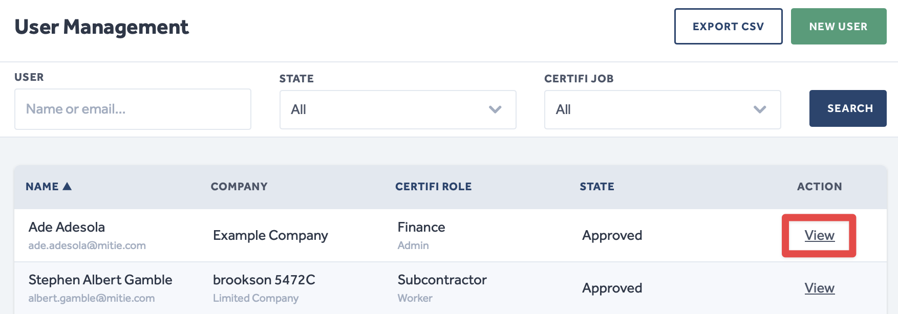 - Once in the User Management menu, select View on the line of the user's profile you wish to edit.