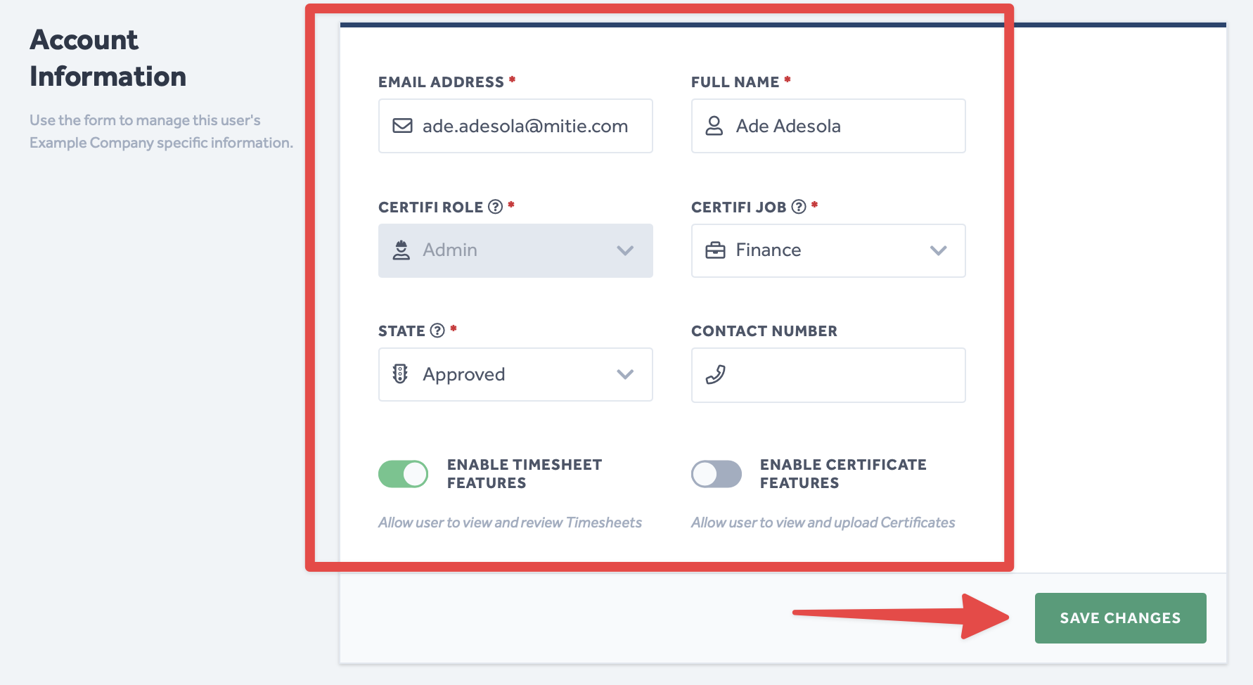 - In the Account Information section, you can edit their profile fields to change the user's work information.
