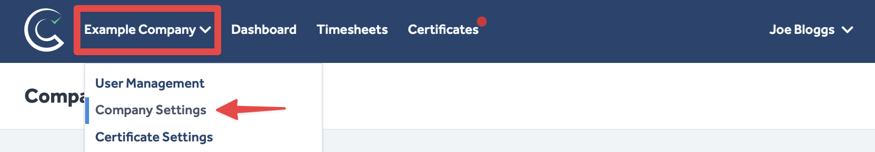 - Click on your company's name in the top left of any Certifi page.