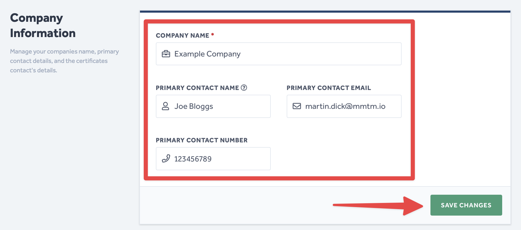 - The Company Information section allows you to edit your company's primary contact information.