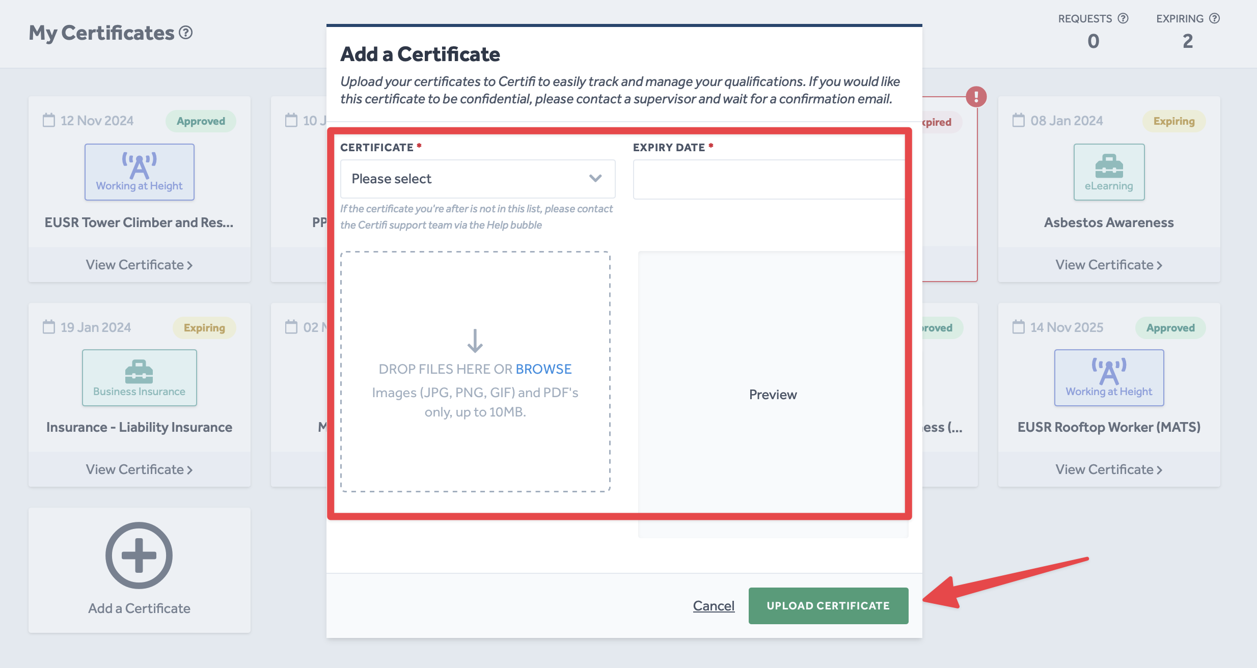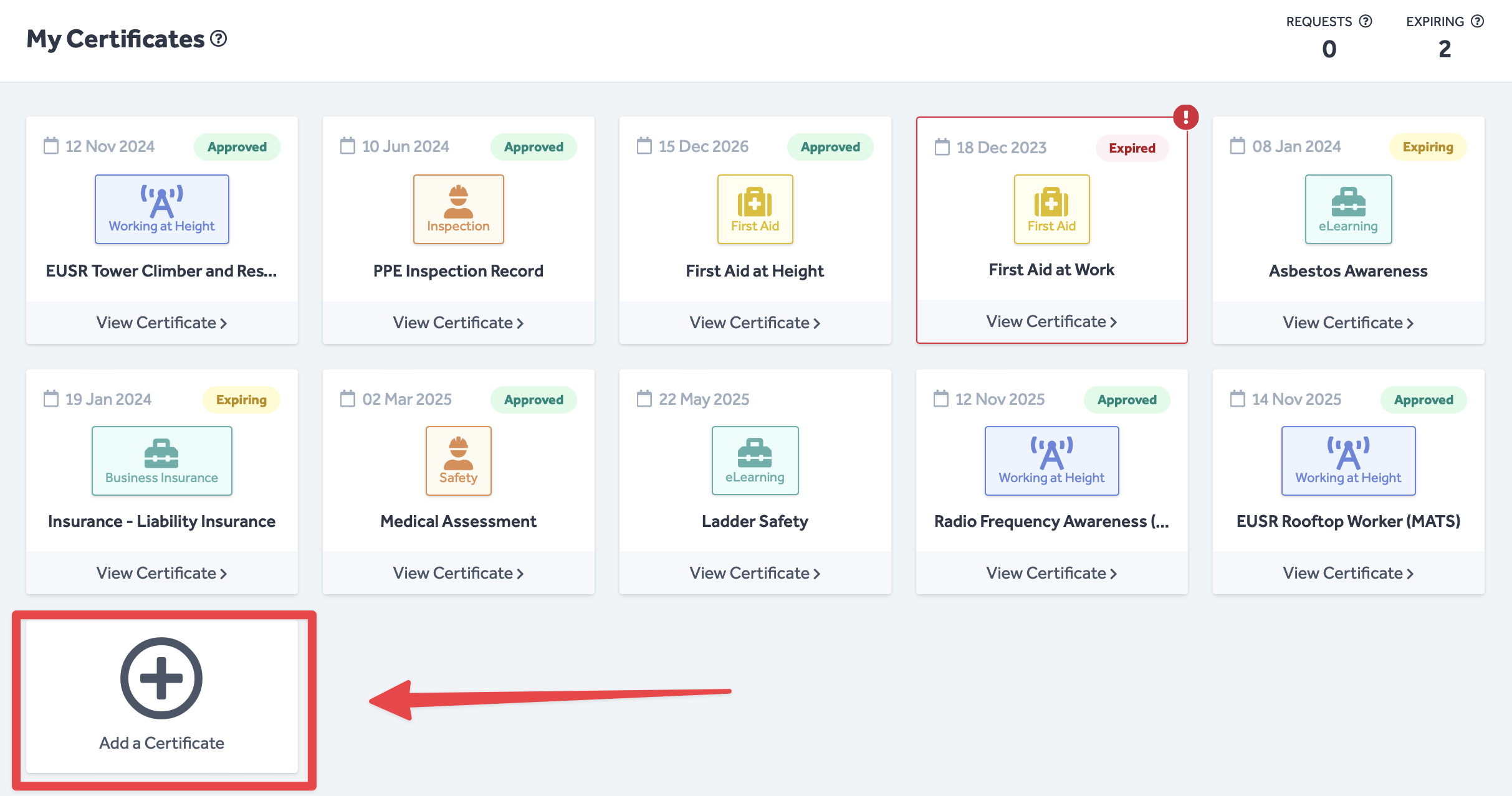 To ensure your compliance to work, it is important to add all of your certificates to your Certifi profile. To add a new certificate to Certifi, follow these steps: